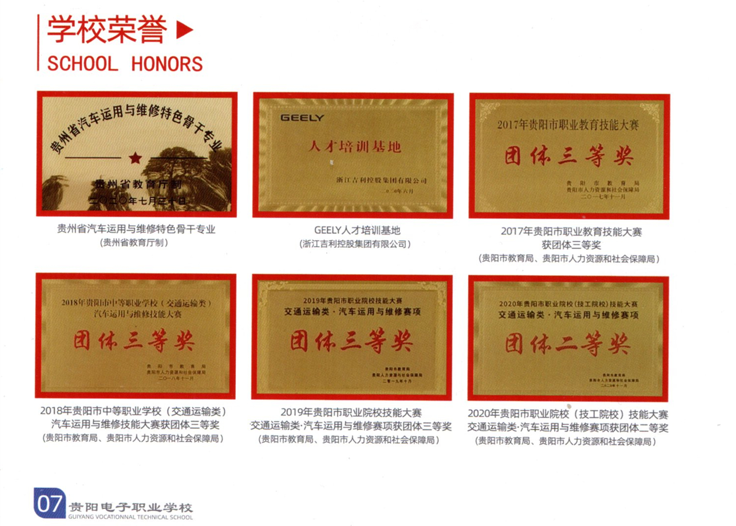 《贵州省汽车运用与维修特色骨干专业》-贵州省教育厅制;《吉利人才培训基地》-浙江吉利控股集团有限公司;《2017年贵阳市职业教育技能大赛团体三等奖》-贵阳市教育局、贵阳市人力资源和社会保障局;《2018年贵阳市中等职业学校(交通运输类)汽车运用与维修技能大赛获团体三等奖》-贵阳市教育局、贵阳市人力资源和社会保障局;《2019年贵阳市职业院校技能大赛(交通运输类)汽车运用与维修赛项获团体三等奖》-贵阳市教育局、贵阳市人力资源和社会保障局;《2020年贵阳市职业院校(技工院校)技能大赛(交通运输类)汽车运用与维修赛项获团体三等奖》-贵阳市教育局、贵阳市人力资源和社会保障局等等。