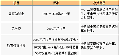 建档立卡户每年减免900元(书本费400元、住宿费500元)。